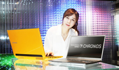 | 삼성전자가 시리즈7에 3세대 인텔 CPU를 적용한 신제품 노트북을 선보였다. 사진은 서초동 삼성전자 홍보관 딜라이트에서 삼성전자 모델이 신제품 시리즈7 크로노스와 게이머 2D 모델을 소개하는 모습. | ||