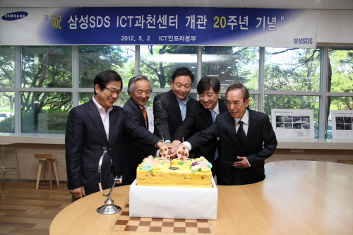 사진은 삼성SDS ICT과천센터의 개관 20주년 기념식에서 떡케이크를 컷팅하는 고순동 삼성SDS 사장(가운데)과 ICT인프라본부장 이경배 전무(우측 두번째), 그리고 역대 센터장. 왼쪽부터 박종암 전 삼성SDS 전무, 문광수 전 삼성SDS 상무, 고순동 삼성SDS 사장, 이경배 삼성SDS ICT인프라본부장(전무), 유창상 전 삼성SDS 상무.