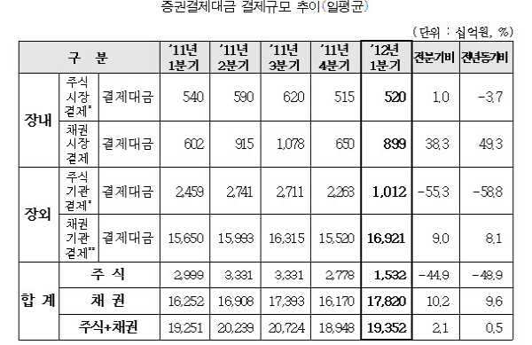 3일 한국예탁결제원에 따르면, 2012년 1분기 증권결제대금 규모는 일평균 19조4000억원으로 전분기 대비 2.1% 증가했다.