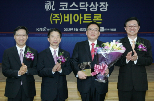 | 왼쪽부터 코스닥협회 김원식 부회장, 거래소 최홍식 코스닥시장본부장, 비아트론 김형준 대표, 한국투자증권 유상호 대표가 상장기념패 전달 후 기념촬영을 하고 있다. | ||