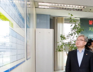 | 6일 아침 솔로몬 등 저축은행 4곳 영업정지 조치로 세 차례에 걸친 저축은행 구조조정이 일단 대강의 매듭을 지은 것으로 보인다. 하지만 김석동 금융위원장은 앞으로도 상시적인 저축은행 퇴출 가능성을 열어 둔 것으로 보인다. 사진은 김 위원장이 현장 순시 중에, 불법사금융 관련 업무상황 현황판을 지켜보는 모습. | ||