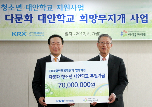 [프라임경제] 한국거래소 국민행복재단(이사장 김봉수)은 사회복지법인 아이들과미래(이사장 송자)와 7일 오후 한국거래소 서울사옥에서 ‘다문화 대안학교 희망무지개 사업’ 협약식을 체결하고 기부금 7000만원을 전달했다.