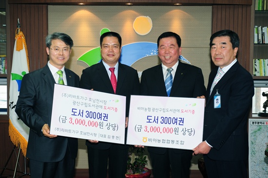 [프라임경제](주)리바트가구 호남전시장과 비아농협은 지난 9일 광산구청을 방문해 도서 600여권(6백만원 상당)을 광산구에 전달했다. 광산구는 지난 4월부터 구립도서관 이용주민과 기관을 통해 총 700여권의 책을 기증받았고, 그중 중복도서 364권을 작은도서관에 분배했다.