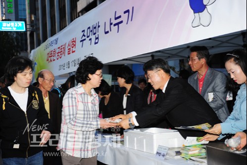 | 지난해 5월 17일 5·18 민중항쟁 기념식 전야제가 열리는 금남로에서 민형배 광산구청장을 비롯한 공직자들이 시민들과 주먹밥을 나누고 있다. | ||