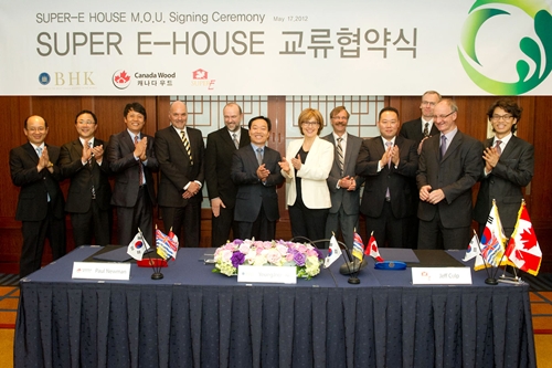 | BHK와 캐나다천연자원부 및 캐나다우드 측 관계자들은 17일 오전 캐나다 브리티시 콜럼비아주 크리스티 클락 수상(가운데 여성)이 참석한 가운데 슈퍼-E 하우스 교류협약식을 가졌다. 클락 수상은 이날 오후 김문수 경기도자사와의 만남 때문에 오후5시부터 진행된 본행사에 참석할 수 없어 본행사에 앞서 미리 협약식을 가졌다. | ||