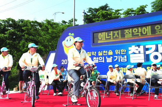 철강 CEO들은 무대 위에서 자전거를 이용해 LED 전광판을 켜는 퍼포먼스와 함께 에너지 절약을 다짐하는 핸드 프린팅 남겼다. 또한 “철강업계는 에너지 절감에 앞장섭니다”라는 문구가 삽입된 기수단을 선두로 대회 참가자들과 함께 출발선까지 이동하며 에너지 절약 실천 의지를 다지기도 했다.