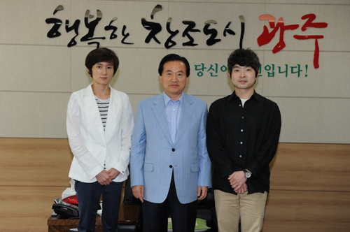 | 강운태 광주시장이 ‘코리아’ 실제 주인공인 현정화 선수(한국 마사회 탁구단 감독), 문현성 영화감독과 함께 기념촬영을 하고 있다. | ||