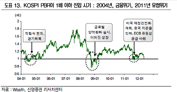 | 29일 신영증권에 따르면 2004년 이후 우리 시장 PBR이 1배 이하로 내려간 경우는 세 번이다. 위기 정도에 따라 다르지만 지난해 유럽위기 당시에는 1배 이하에 머문 영업일이 8거래일에 그쳤고 주식투자성과는 1주일, 1개월, 3개월, 6개월 모두 양호했다. | ||