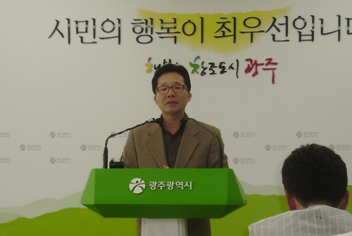 | 노희용 광주시 문화관광체육정책실장이 4일 오후 광주시 3D 컨베팅사업과 관련 귀국 기자회견을 열고 있다. | ||