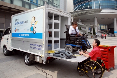 | 이동수리차량에서 전동휠체어 수리가 진행되고 있다. | ||