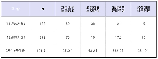 지난해 7월 시행된 복수노조 구제제도 사건은 올해 5월까지 누계기준으로 412건이 접수됐다. 사건접수 추이는 작년 6개월간 133건이던 것이 금년에는 5월까지 279건이 접수돼 대푹 증가 추세를 보였으며, 올해 들어 월별 증가 추세도 뚜렷하게 나타났다.