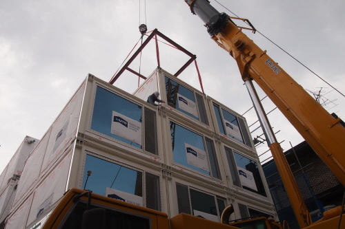 이날 행사를 통해 포스코A&C는 공장에서 제작한 모듈러를 현장에서 건립하는 과정을 소개했다. 포스코A&C에 따르면 이동식 모듈러방식이 적용된 포스코패밀리 직원 숙소는 천안 모듈러 공장에서 구조체, 설비 배관, 전기 배선, 조명, 화장실, 부엌, 가구 등이 빌트인 시스템으로 최대 80%까지 제작돼 현장서 단 3일만에 조립, 설치됐다.