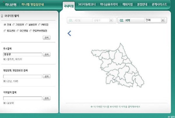 | 하나은행에서 강원도의 지점을 검색할 필요가 있는 경우, 다음과 같이 지도를 활용, 각 군으로 클릭해 들어갈 수 있다. | ||