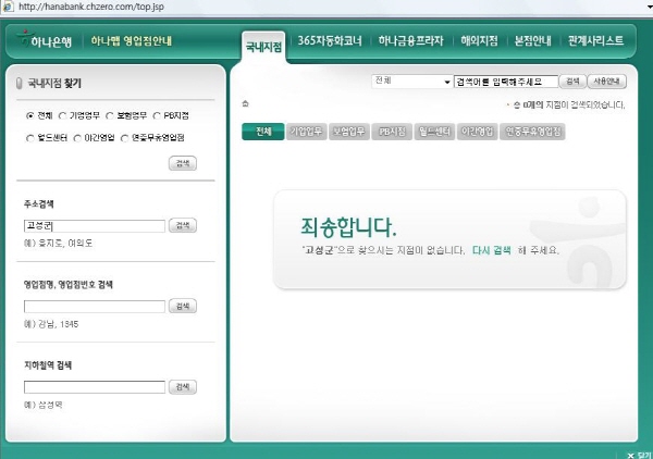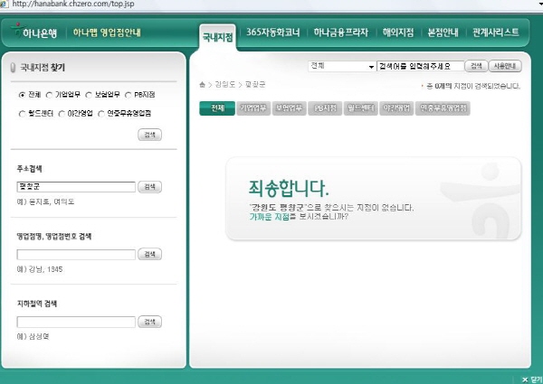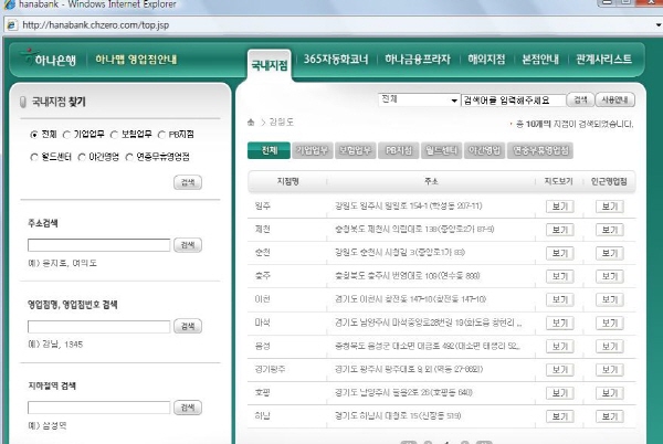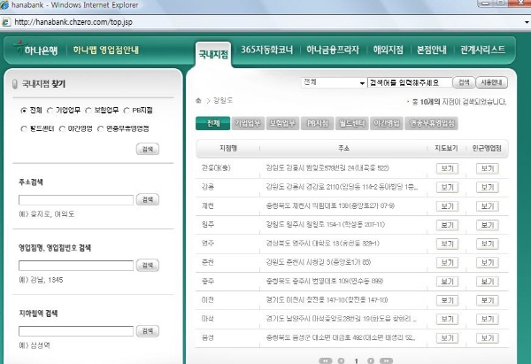 하나은행의 영업점 찾기 기능을 실제로 돌려보니, 주소, 전철역이나 영업점명 등으로 편리하게 가까운 지점을 찾을 수 있게 돼 있다. 하지만 막상 하나은행의 홈페이지는 우리나라의 상당 부분을 차지하는 도시 외 지역의 주소 검색에는 어려움이 큰 운영 패턴을 가진 것으로 보인다.