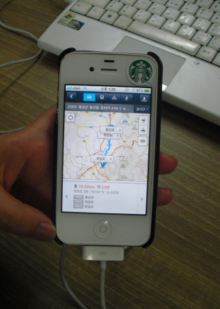 | 하나은행 가까운 지점 보여주기 기능의 신뢰도 검사를 위해 샘플 검사를 진행했다. 스마트폰에서 네이버 지도앱을 구동해 거리(차량 이동 가능 도로 기준)를 측정하는 모습. | ||