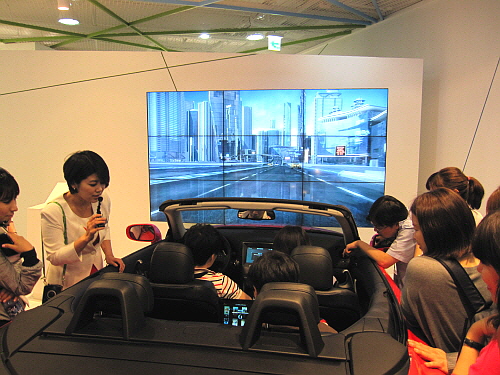 1층 전시장 중앙에 빨간 스포츠카 한 대가 눈에 띈다. 미래 ‘스마트 카’를 체험하려는 관람객들이 줄을 길게 늘어서 있다. 궁금한 탓에 발뒤꿈치를 들고도 모자라 목까지 내밀고 살펴보니, 비치된 스마트폰으로 스마트카를 조종할 수 있는 만능열쇠가 보인다.