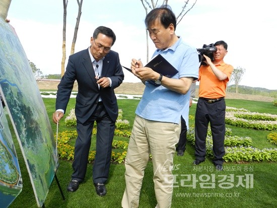 [프라임경제] 민생탐방차 전국 주요도시를 순회중인 새누리당 이재오 의원(사진 오른쪽)이 19일 전남 순천시를 방문, 2013순천만정원박람회 공사현장을 찾아 최덕림 박람회 사무국장의 브리핑을 받고 있다. 최덕림 국장이 현황판 아래쪽 순천만 습지를 가리킬때는 때때로 무릎을 꿇어가며 열정적으로 설명하는 모습이 인상적이다. 이재오 의원은 "수고 많으십니다"를 연발하며 꼼꼼히 메모하고 있다. 또 "순천정원박람회는 순천시의 행사가 아닌 국가가 관심을 가져야 할 사업이다"고 시청 관계자들을 치켜 세우기도 했다.