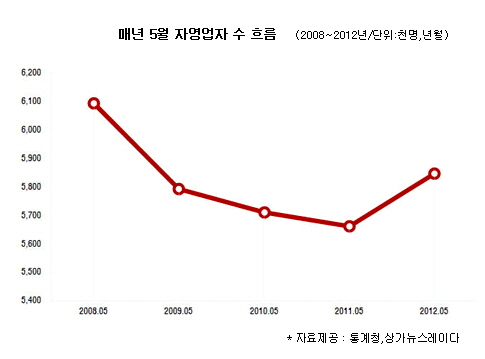 이는 2008년 12월 ~ 2012년 5월까지 42개월 동안의 기간 중 가장 높은 수치다. 국내 자영업자 수치는 2008년 11월 600만 2800명을 기록한 후 최근까지 매월 520만~580만 초반대를 유지해왔다.