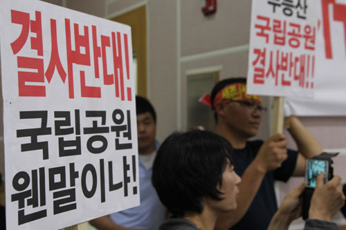 | 20일 오후 광주시 서구 치평동 영산강유역환경청 대강당에서 열린 ‘무등산국립공원 지정 공청회’에서, 국립공원 승격을 반대하는 주민들이현수막 등을 이용해 항의하고 있다. | ||
