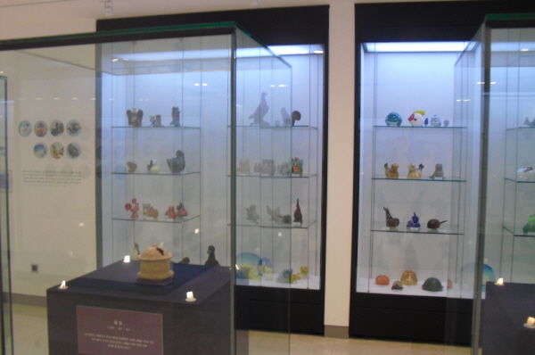 | 세계 각국에서 수집돼 온 저금통. 앞에 토기 재질로 된 로마 시대 저금통이 보인다. | ||
