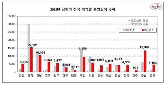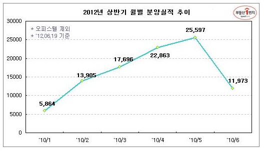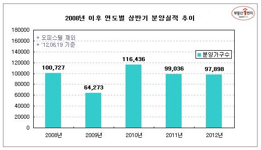 부동산1번지가 2012년 6월 19일까지 분양실적을 조사한 결과 전국 9만7898가구가 일반에 공급된 것으로 나타났다. 이는 작년 상반기 실적(9만9036가구)과 엇비슷한 수치다.