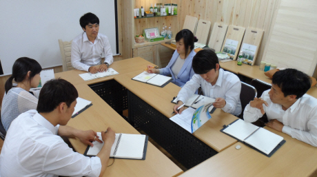 | 편백나무로 인테리어된 동우씨엠 회의실, 좋은회사 만들기가 꿈인 이 대표는 직원들과 웃으며 회의를 이끌어 나갔다. | ||