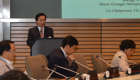 강운태 시장은 지구를 살릴수 있는 광주시 환경철학과 광주시 저탄소 녹색도시 만들기 전략, '도시 CDM'의 씨앗인 ‘탄소은행제도’와 전 지구적 환경협력 방안 등을 소개하면서, 작년 10월 ‘UEA 광주정상회의’ 당시 세계 120여개 도시와 국제기구가 약속한 ‘도시환경평가지표’와 ‘도시CDM’을 하루빨리 개발해 선진국·개도국 도시에 보편적으로 적용할 것을 제안했다.