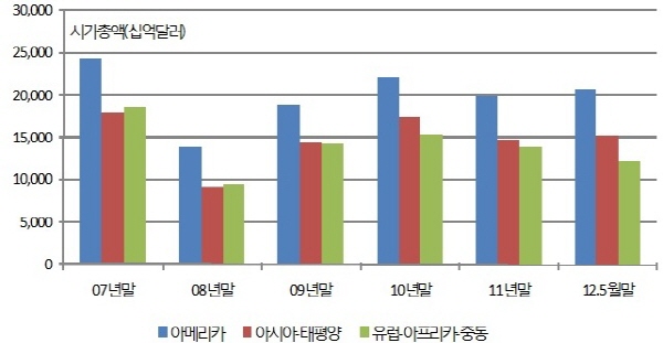 거래소 조병인 홍보1팀장은 “유럽 경제위기 등의 영향으로 인해 아프리카, 중동을 포함해 유럽 지역의 시가총액이 가장 많이 감소했으며 아메리카, 아시아-태평양 지역은 소폭 증가했다”고 설명했다.