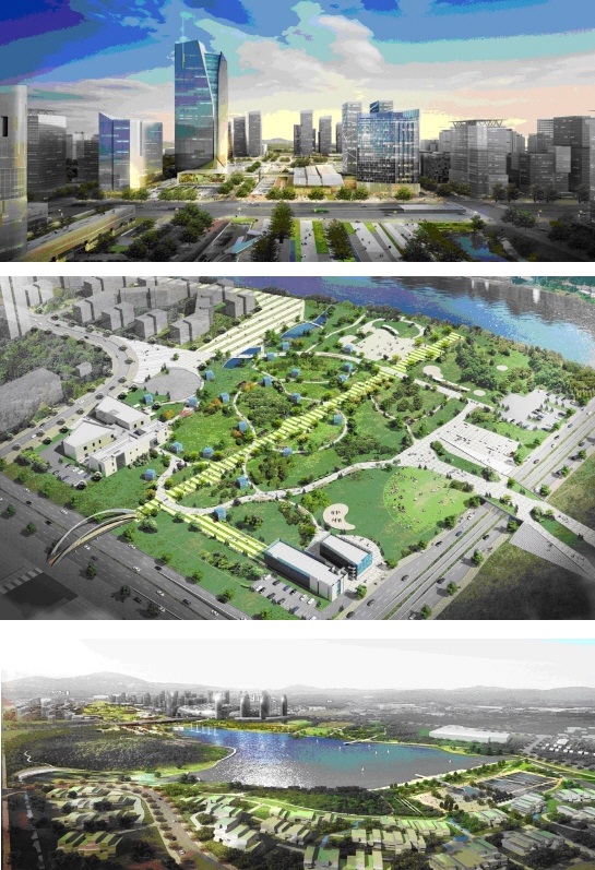 | 위에서 부터 광역비즈니스콤플렉스, 문화디자인밸리, 워터프론트콤플렉스 조감도. 자료제공: LH공사 | ||