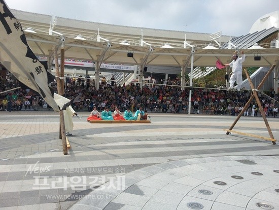| 여수엑스포 줄타기 광대 김대균씨가 줄위에 서서 중심을 잡고 걸어나가는 연기를 보이고 있다. 객석들의 열화와 같은 박수를 받은 가운데 특히 중장년층 관람객들로부터 높은 인기를 끌었다. | ||