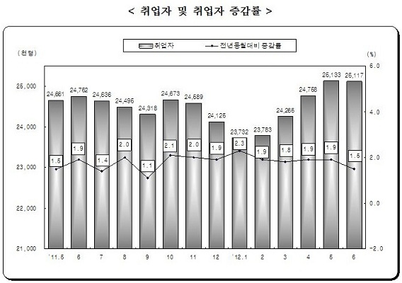 6월 고용률은 60.4%로 전년 대비 0.1%p 상승했다. 통계청은 서비스업 취업자 수 증가와 제조업 취업자 수 감소폭 둔화 등으로 전년 대비 취업자 수는 늘었으나, 지난해 6월 기저효과 등으로 취업자 수 증가폭은 다소 줄어들었다고 설명했다.