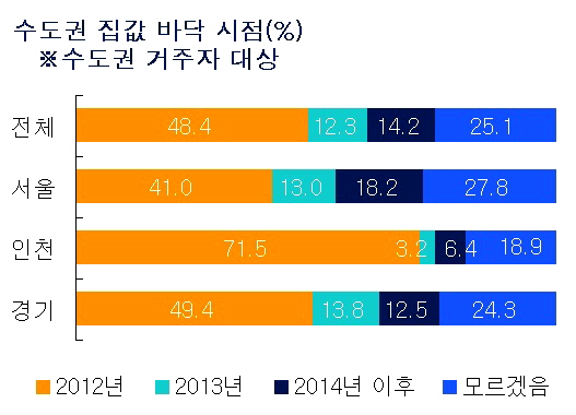 실제로 수도권 집값 바닥 시점을 묻는 질문에 올해라는 의견이 지배적이었다. 수도권 거주자 2명 중 1명(48.4%)은 집값 바닥 시점으로 ‘2012년’을 꼽았고 이어 △‘모르겠다’(25.1%) △‘2014년 이후’(14.2%) △‘2013년 상반기 또는 하반기’(12.3%) 순으로 집계됐다.