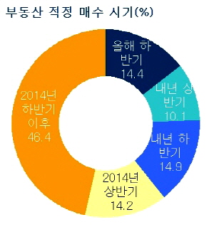 주택, 상가, 토지 등 부동산을 매수하기에 가장 적절한 시기에 대해서는 전체 응답자의 60.6%가 ‘2014년 이후’라고 답했다. 올 하반기와 내년을 꼽은 응답자는 각각 14.4%, 24.9%에 그쳤다. 바닥 인식과 별개로 매수 타이밍을 뒤로 미루는 경향은 여전한 것으로 파악됐다.