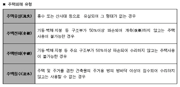 다만 장기여행, 장기입원 등으로 피해상황 파악을 할 수 없거나 고령자 또는 독거노인으로서 신고할 능력이 없는 경우 신고기한이 일부 연장된다. 피해에 대한 구체적인 내용은 담당공무원이 현지 확인 후 △유실 △전파 △반파 △침수 등을 판단한다.
