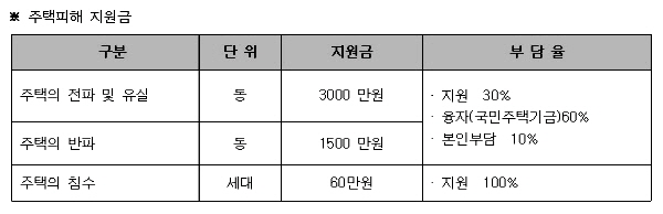 주택의 전파 및 유실의 경우는 동별로 3000만원 한도 내에서 30%(900만원)가 지원된다.