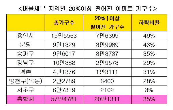 부동산포털 닥터아파트가 지난 2006년 버블세븐 지정 당시부터 2012년 7월 현재까지 버블세븐지역 57만4781가구 아파트 값을 조사한 결과 35%인 20만1311가구에서 20%이상 가격이 떨어진 것으로 나타났다.