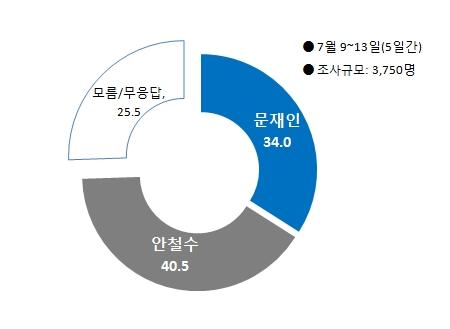 여론조사 전문기관 리얼미터(대표 이택수)의 7월 둘째주 주간집계 결과, 40.5%를 기록한 안 원장이 34.0%의 문 고문을 소폭 앞서는 것으로 나타났으며, 지지정당별로는 민주통합당 지지층에서만 44.9%를 기록한 문 후보가 44.0%를 기록한 안 원장을 오차범위 내에서 앞섰다. 다른 정당 지지층은 모두 안 원장이 앞섰다.