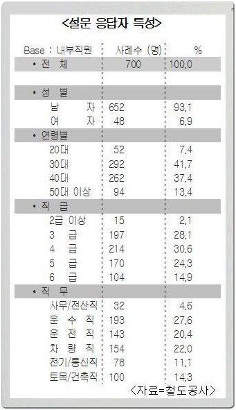 이번 조사는 철도공사가 지난 11일 한국사회여론연구소(KSOI)에 의뢰해 임직원 700명을 대상으로 여론조사를 한 결과(표 참고)로, 표본 추출은 전체