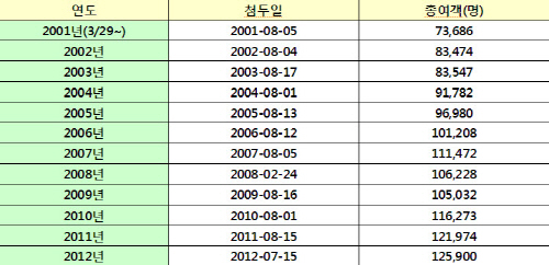 | 개항 이후 연도별 첨두일 이용객수 | ||