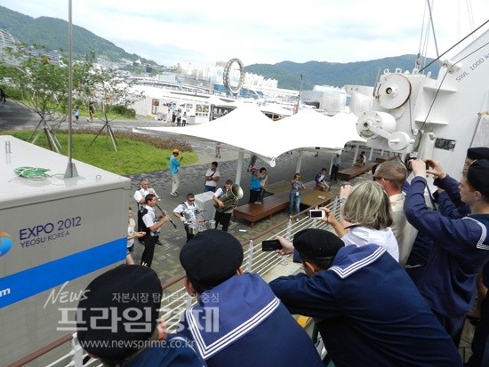 | 18일 러시아 범선 팔라다호 승선 해양 대학생들이 여수엑스포장 거리공연을 감상하며 사진을 담아두느라 여념이 없다. | ||