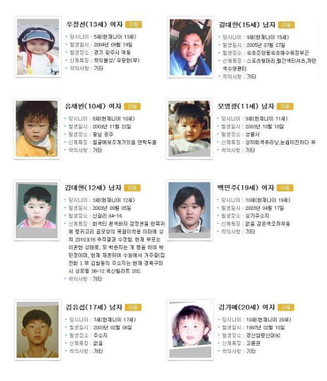 문제는 통영 초등생 같은 사건이 더욱 많을 수 있다는데 있습니다. 겉으로 드러나지 않아서 그렇지 우리나라의 경우, 2008년 1만8580건이던 실종아동 등 발생신고는 2011년 2만6349건으로 급증했습니다. 사진 속 아이들 역시 경찰청 홈페이지에 게재된 실종아동 들의 모습입니다.