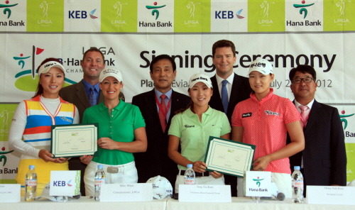 | (앞줄 왼쪽부터) 하나금융그룹 소속 박희영 선수, 크리스티 커 선수, 김인경 선수, 이미림 선수. (뒷줄 왼쪽부터) LPGA투어 마이크 완 회장, 하나금융그룹 김정태 회장, IMG 라비 헨치먼 부사장, J골프 김동섭 대표이사. | ||