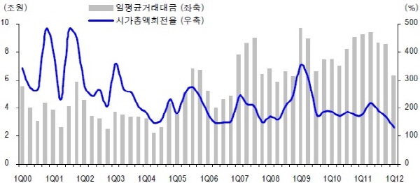 | 2000년 이후 일평균거래대금 및 시가총액회전율, 한국거래소·신한금융투자 제공. | ||