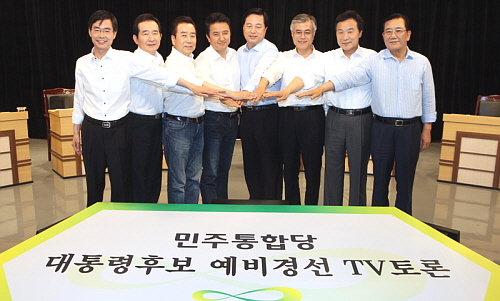 | 민주통합당 대선 경선 후보 8명. 왼쪽부터 조경태, 정세균, 김정길, 김영환, 김두관, 문재인, 손학규, 박준영 후보. | ||