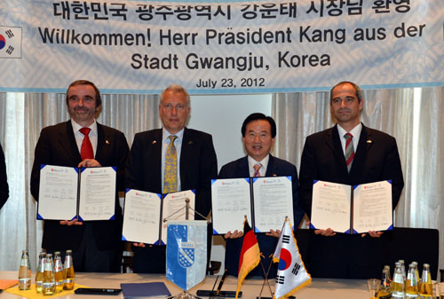 [프라임경제] 강운태 광주시장은 유럽 출장기간 중 신재생에너지산업 선진도시인 독일 카셀시를 23일 오후(현지시간) 방문해 신재생에너지 전문기업 컨소시엄과 광주시 신재생에너지 기본 방향에 대한 연구프로젝트 추진을 위한 업무협력 협약을 체결했다.