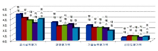 자본금 등 재무상태를 나타내는 경영평가에선 현대건설이 3조3955억원을 기록해 1위에 올랐으며, 대림산업과 GS건설이 각각 3조256억원‧2조7845억원을 기록해 2‧3위에 이름을 올렸다.