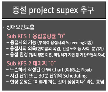 한마디 덧붙인다면 목표하였던 공기 단축은 SUPEX 목표 일수인 60일을 훨씬 하회하는 49일에 완공되어 초과 달성되었다. 조기 완공에 대한 보너스를 SK건설에 지불하려고 하자 SK건설 사장은 손을 내저었다. 비록 단가 높은 용접사를 투입하는 등 부분적으로 비용 증가 요인이 없었던 것은 아니나, 공기단축으로 인해 이미 충분한 공사비 절감이 이루어져서 보너스까지 받을 염치가 없다는 것이 그 이유였다. 그뿐 아니라 이 공동 SUPEX 추구를 통하여 많은 것을 배웠으며 그것으로 이미 충분히 보상을 받았다는 것이었다.
