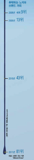 [프라임경제] 무너지지 않을 것 같은 기세로 휴대폰업계를 장악하던 세계 1위 노키아의 몰락이 속도를 더하고 있다. 2009년 세계 9위를 달리던 노키아 브랜드 가치는 지난해 81위까지 떨어졌다.