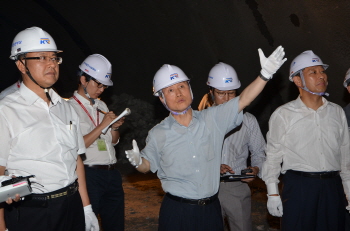 | 국토해양부 권도엽 장관이 2일 제4공구 터널시공현장을 시찰하고 있다. | ||
