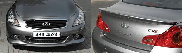 뿐만 아니라 G시리즈의 혈통임을 알 수 있는 L자형 LED 리어램프·트렁크와 일체형으로 디자인 된 스포일러·듀얼 머플러로 마무리된 후면부의 스포티함도 G37R 뒤태의 아름다운 매력을 살려주고 있다.